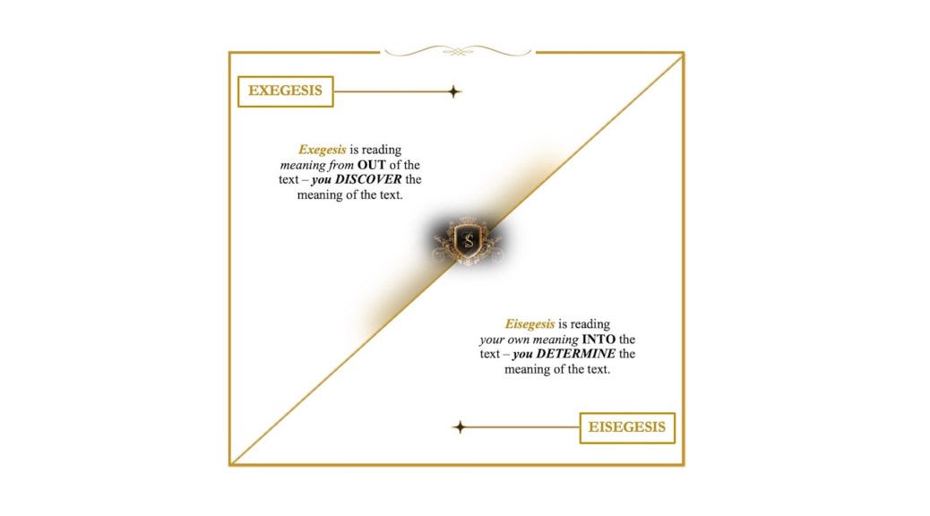 EXEGESIS is based on responsible handling of the Word of God as the reader seeks to follow scripture authentically to draw true information and meaning OUT OF THE TEXT while allowing God’s Word to speak for itself with authority. In so doing, the reader remains respectful to both its Historical Context and Literary Context; as well as being mindful of cultural settings and linguistical syntax in which the writer lived to avoid coalescing personal beliefs, ideas, and notions. Reading with an EXEGESIS mindset reduces the risk of…Misinterpretation, Misrepresentation, and Misunderstanding…and allows understanding to what the Word of God is really saying. As a result, the reader can proceed to apply it to actualities of our time and situation.